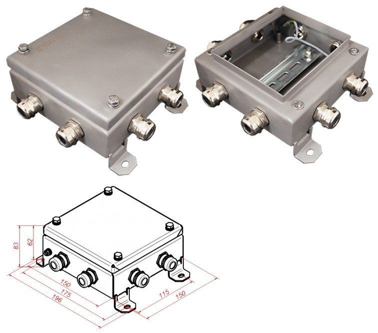 Коробка монтажная с DIN-рейкой Ω-типа шириной 35 мм и высотой 7.5 мм, 8 вводов, IP66, tраб.-40…+60°С, габ.размеры 150х150х60 мм, вес 1.45кг, нержавеющая сталь