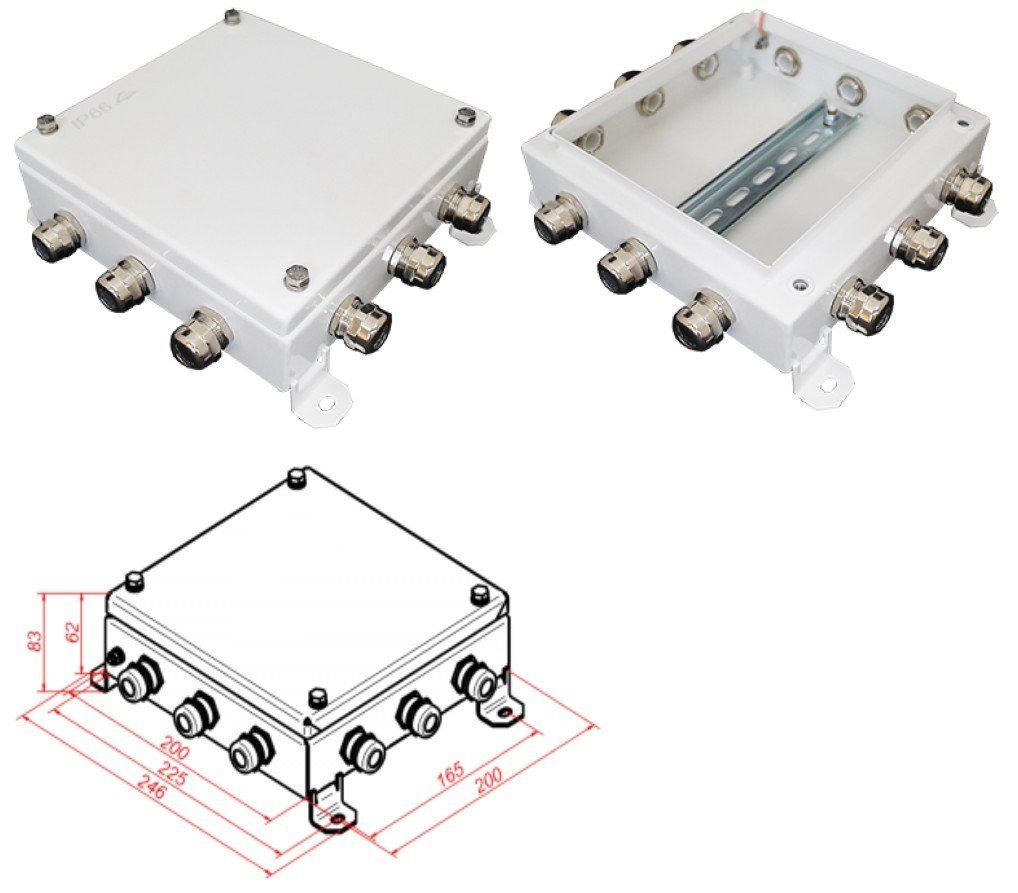Коробка монтажная с DIN-рейкой Ω-типа шириной 35 мм и высотой 7.5 мм, 12 вводов, IP66, tраб.-40…+60°С, габ.размеры 200х200х60 мм, вес 2.09кг, оцинкованная сталь с полимерной окраской