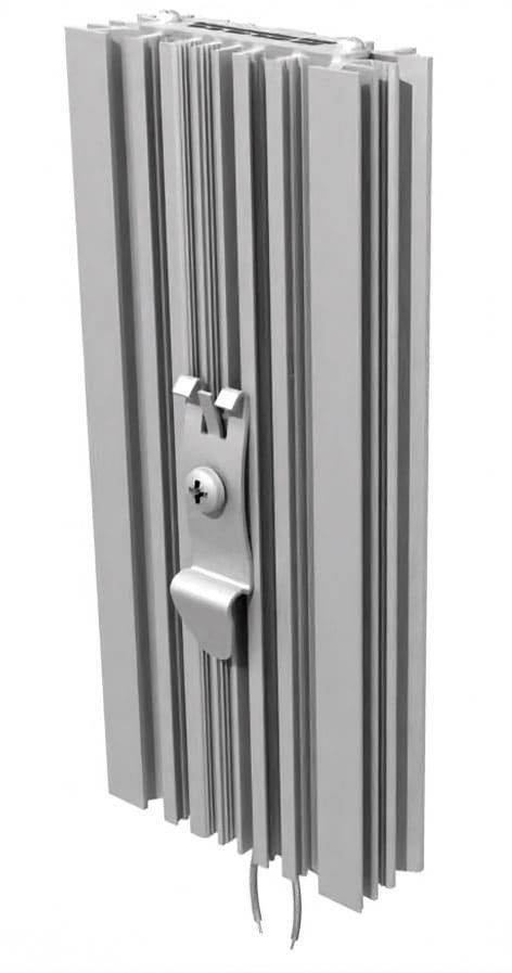 Обогреватель на DIN-рейку для воздушного обогрева пространства внутри электротехнических шкафов; мощность 100 Вт, t-макс. на поверхности 145°C, U-пит. 230 В, IP20, габ.размер 65х150х23 мм. Корпус - анодированный алюминий