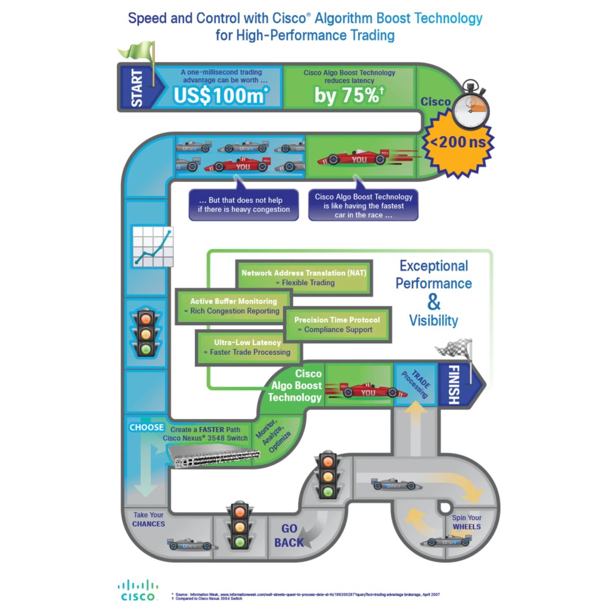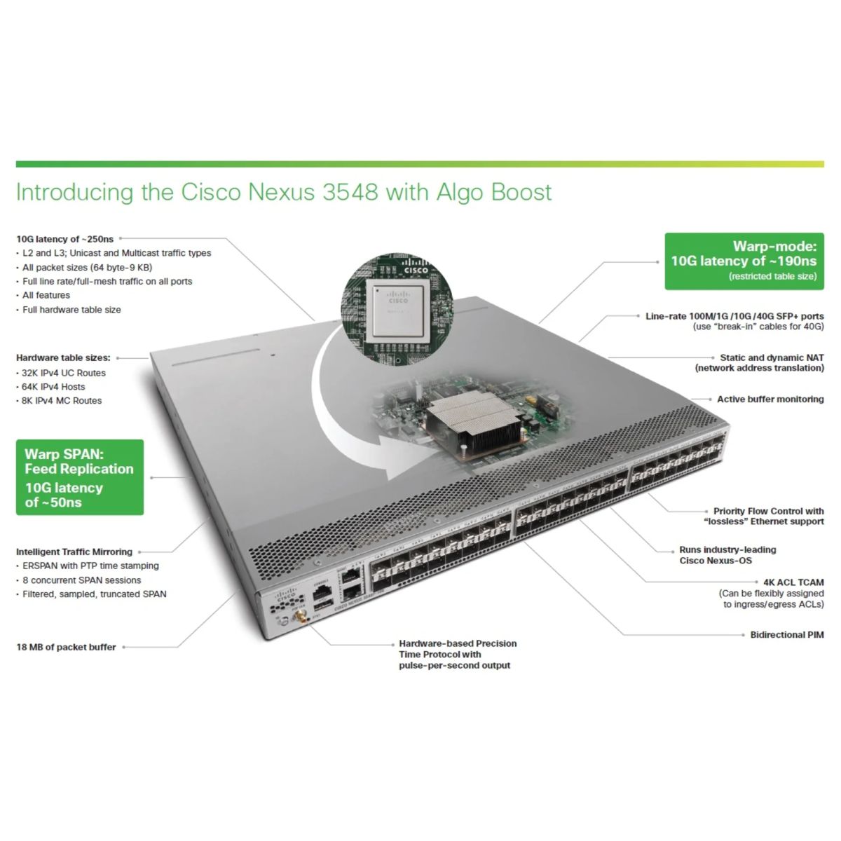 Коммутатор Cisco Nexus 3548 работающий в режиме "warp" обладает ультранизкой задержкой (от 250 до 190 наносекунд) в среде с малыми и средними требованиями к масштабированию Layer 2 и Layer 3. Кроме того, этот коммутатор облегчает эффективную доставку биржевых данных на финансовые торговые серверы: с помощью функции warp SPAN данные доставляются всего за 50 наносекунд.