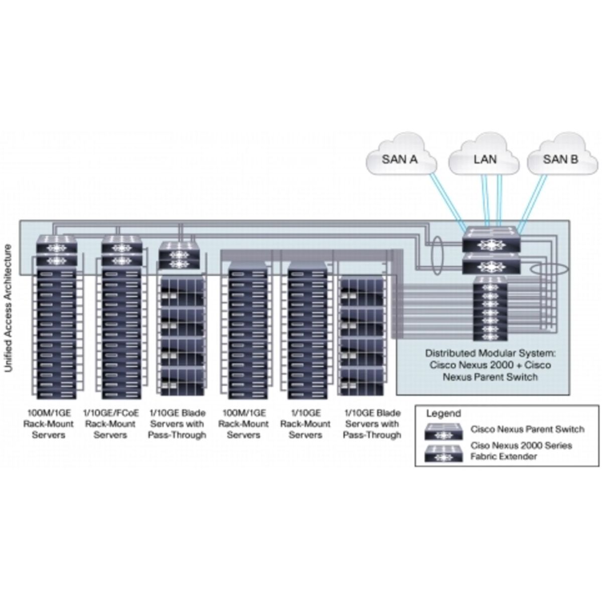 Один из сценариев использования предусматривает установку в каждую стойку центра обработки данных двух Cisco Nexus 2200 Fabric Extender, подключенных к двум коммутаторам семейства Cisco Nexus 5548. К каждому Fabric Extender можно подключить до 48 серверов по 100/1000BASE-T, 1- 10GE/ FCoE (SFP+), 1- 10G Base-T, 1- 10G Base-KR (SFP+).