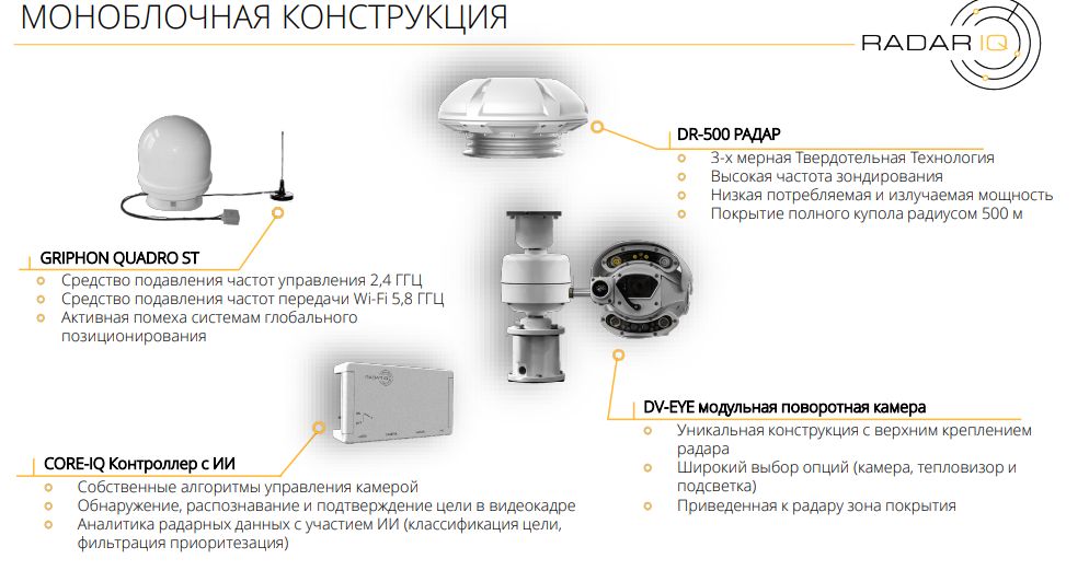 Система противодействия беспилотникам «Radar-IQ» с подавителем GRIPHON поможет защитить территории объектов критической инфраструктуры, частных владений, режимных и спецобъектов. С помощью данной системы по радиолокационной технологии угрозы определяются задолго до того, как они проникнут на территорию (при этом все угрозы детектируются до линии виртуального периметра). Главным компонентом мультиспектральной системы является Искусственный Интеллект с нейросетевыми алгоритмами, что обеспечивает высокую надежность и достоверность защиты, а подавление осуществляет GRIPHON QUADRO ST, который блокирует не только навигационные системы квадрокоптеров (для потери ориентации с пространстве), но и каналы управления данными девайсами, что заставляет их приземляться вне охраняемой зоны.