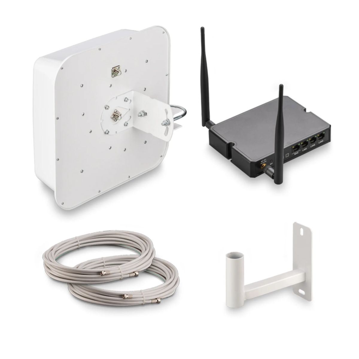 Комплект оборудования для приёма интернета через сеть мобильной связи. Состоит из направленной широкополосной антенны с коэффициентом усиления 15 dBi, роутером со встроенным 4G модемом с поддержкой LTE Cat.4, кабельных сборок длинной 10м с разъёмами F-male (2 шт.) и кронштейна с комплектом метизов.