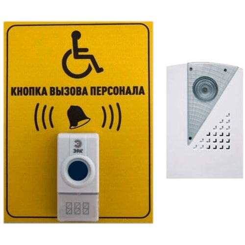 В комплект входят: влагозащищенная кнопка вызова, приёмник и информационная табличка для инвалидов.