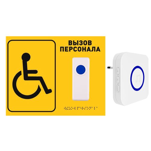 В комплект входят: кнопка вызова, приёмник и информационная табличка для инвалидов со шрифтом Брайля.
