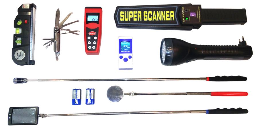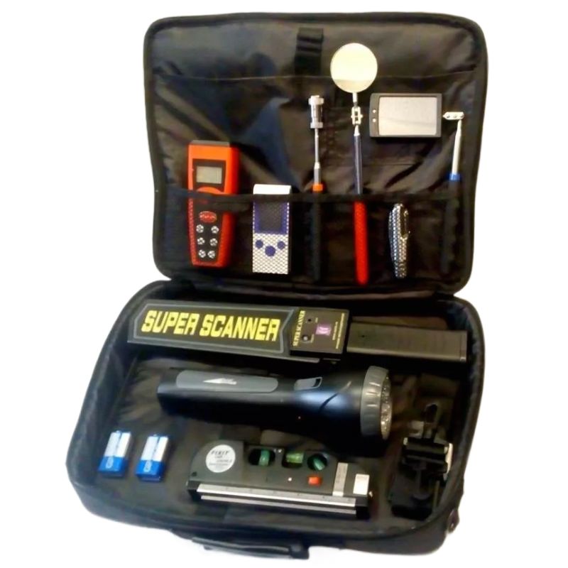 В наборе собраны все самые необходимые устройства для осуществления качественного визуального контроля и проведения замеров. Металлодетектор ручного типа имеет два сигнала обнаружения — звуковой и вибро, размещается в удобном поясном чехле. Особенности других досмотровых средств: