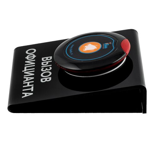 Удобный комплект является частью системы вызова персонала iBells. На подставке предусмотрена надпись, которая помогает гостям понять, что они могут вызвать официанта новым способом.