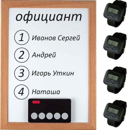 Комплект включает в себя: влагозащищенную кнопку вызова iBells 350, 4 наручных пейджера официанта iBells 203 и маркерную доску.