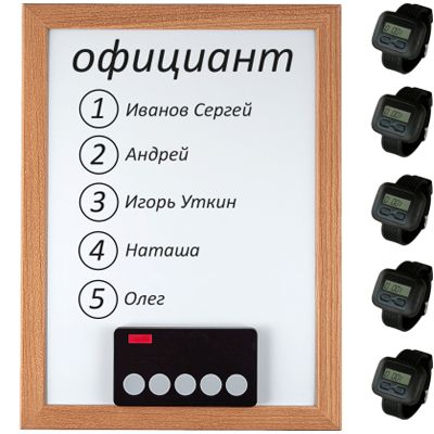 Комплект включает в себя: влагозащищенную кнопку вызова iBells 350, 5 наручных пейджеров для официантов iBells 203 и маркерную доску.