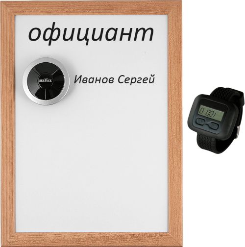 Комплект включает в себя: влагозащищенную кнопку вызова iBells 315, наручный пейджер официанта iBells 203 и маркерную доску.