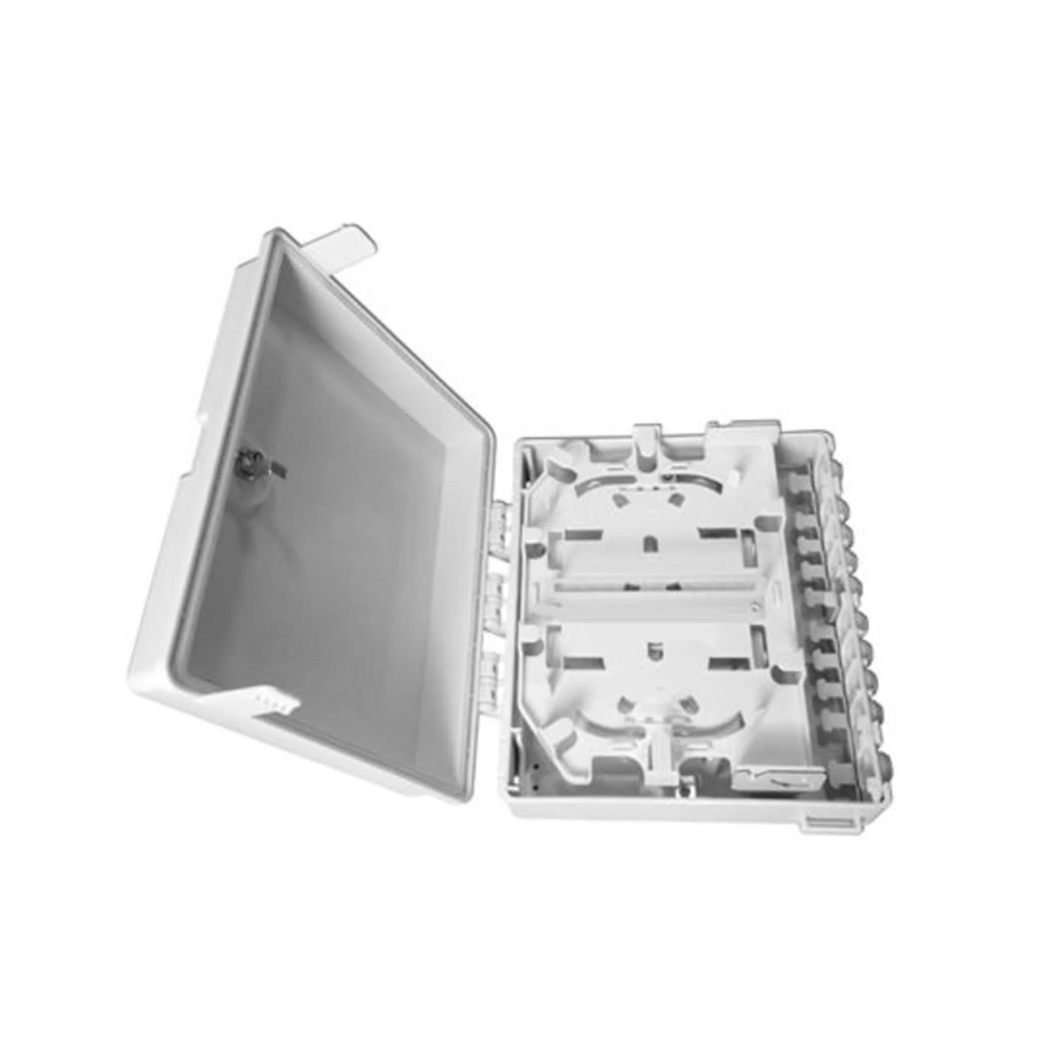 Внутри бокса расположена 1 откидная сплайс-кассета, которая рассчитана на 8 сварных соединений. Помимо защитных гильз в сплайс-кассете предусмотрена возможность размещения оптического делителя.