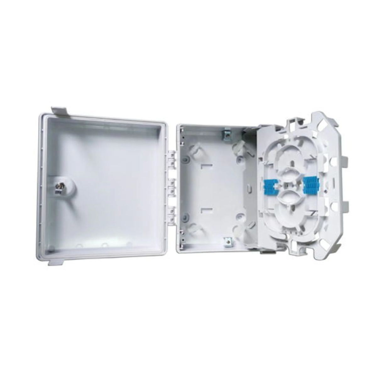 Конструкция коробки позволяет осуществить ввод 2 оптических кабелей. В качестве абонентских выводов используются FTTH патчкорды необходимой длины. Дополнительная дверца в нижней части коробки позволяет оперативно получить доступ к установленным адаптерам SC/LC Duplex (максимум 8 шт) и произвести подключение патчкордов без открытия основной крышки бокса.