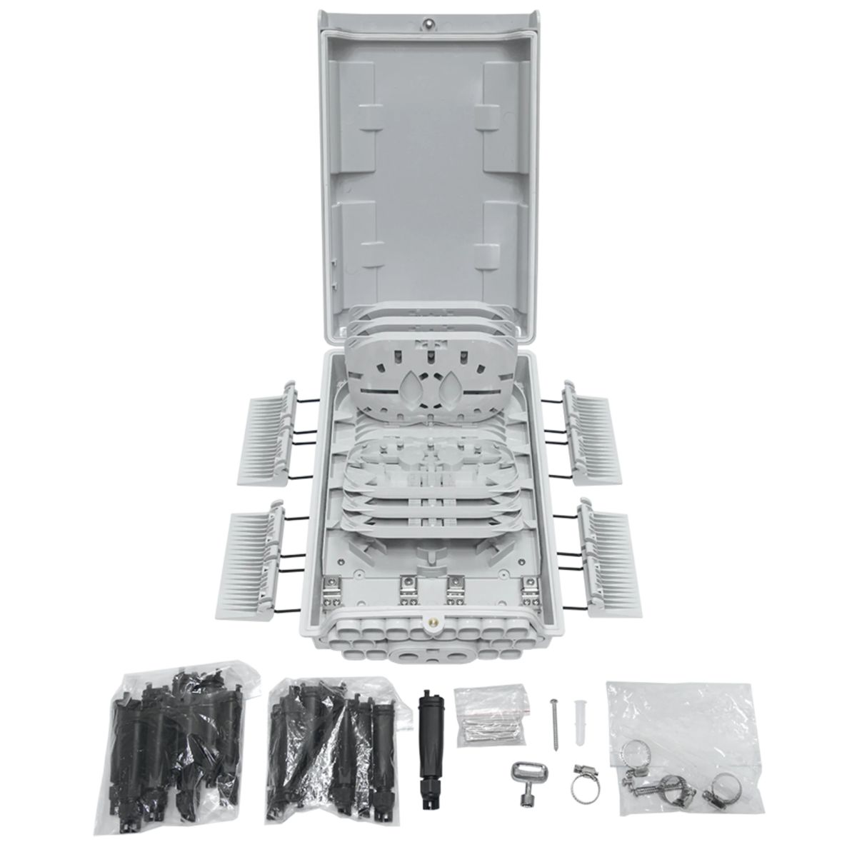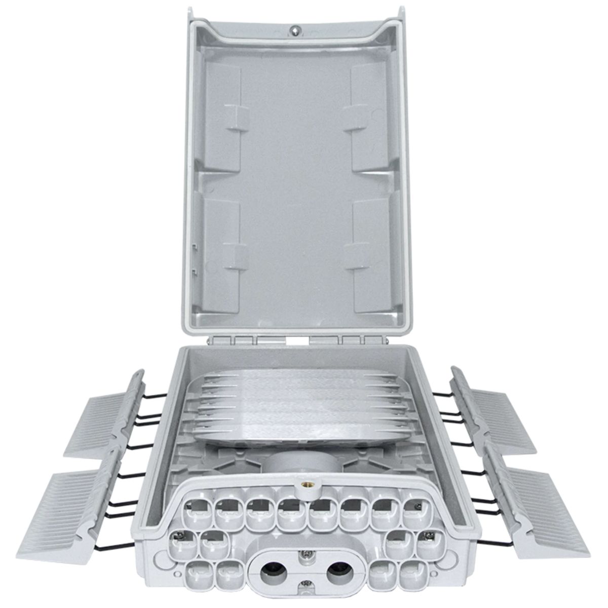 Внутри бокса расположены откидные монтажные панели, на которых находятся места для фиксации защитных гильз и размещения оптических делителей 1/16, что позволяет использовать бокс в PON сетях.