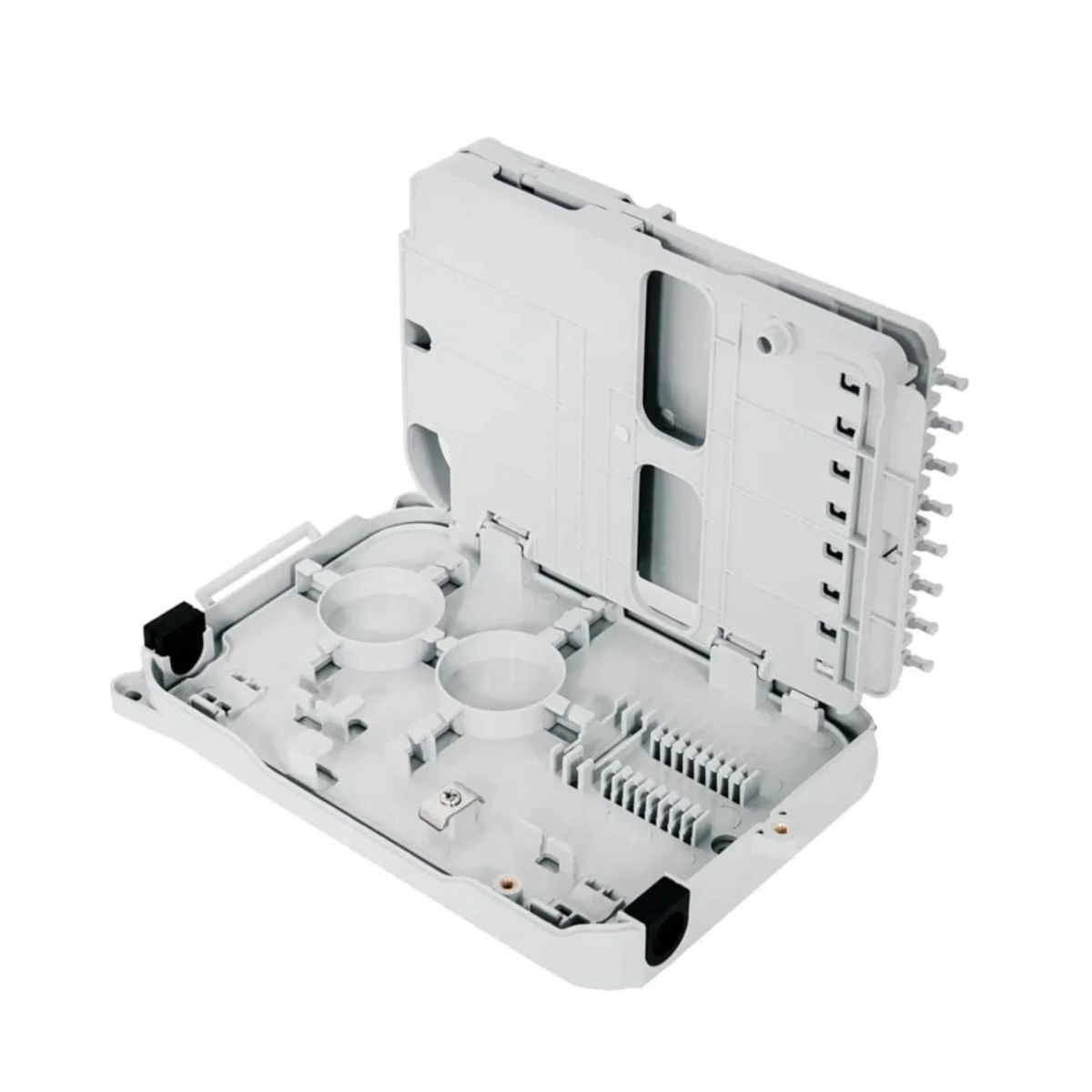 Внутри бокса расположены 2 откидные сплайс-кассеты, каждая из которых рассчитана на 8 сварных соединений. Помимо защитных гильз в сплайс-кассете предусмотрена возможность размещения оптического делителя.