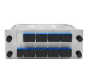 Внутри бокса расположена откидная монтажная панель, на которой размещен кронштейн для установки до 4 оптических адаптеров типа SC/LC Duplex . С другой стороны панели находятся места для фиксации защитных гильз и размещения оптических делителей.