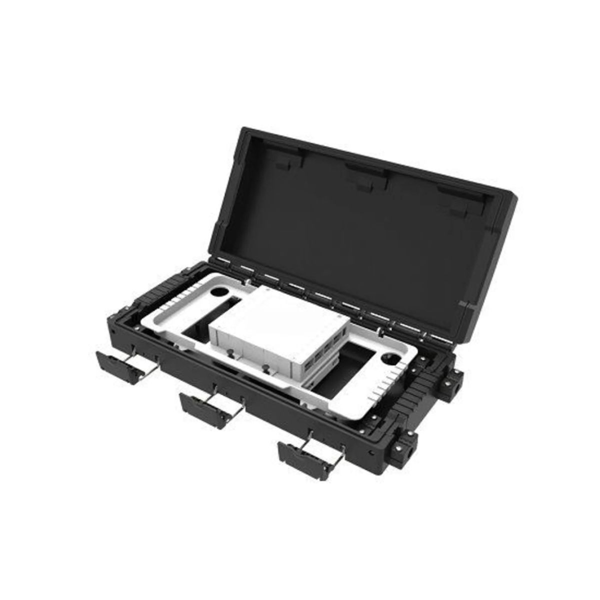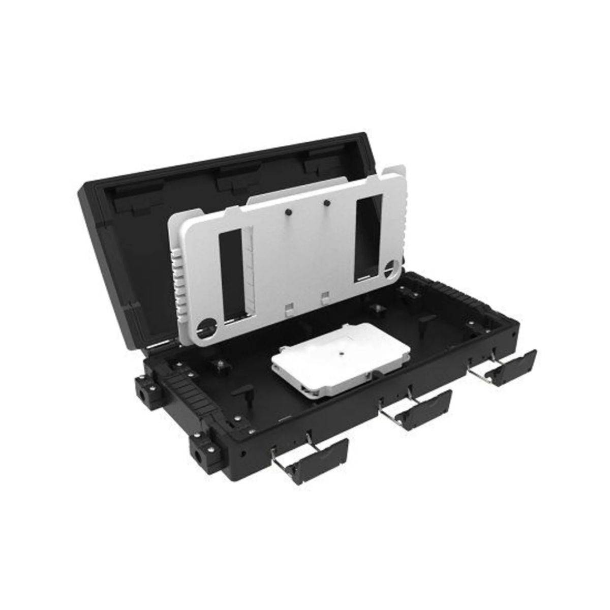 Внутри бокса расположена откидная монтажная панель, на которой размещен кронштейн для установки до 12 оптических адаптеров типа SC/LC Duplex . С другой стороны панели находятся места для фиксации защитных гильз и размещения оптических делителей.