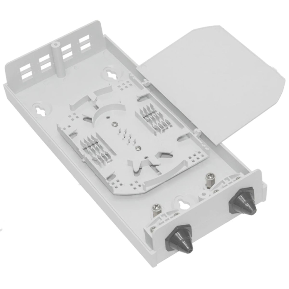 Простая конструкция кросса позволяет осуществлять удобный и быстрый монтаж оптических сетей, а так же пропустить кабель транзитом, разварив до 16 оптических волокон.