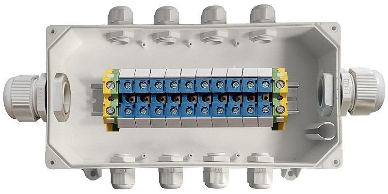 Коробка соединительная для нагревательных кабелей, 12 проходных клеммных пар под зажим провода сечением 10 мм², U-раб. ≤600 В, I-раб. ≤70 А; 2 каб.ввода ПКВ М25х1,5 (под кабель Ø 11-17 мм), 8 каб.вводов ПКВ М20х1,5 (под кабель Ø 6-12 мм); IP66, t-раб. -65...+70°C, габ.размеры с каб.вводами 370х220х92 мм