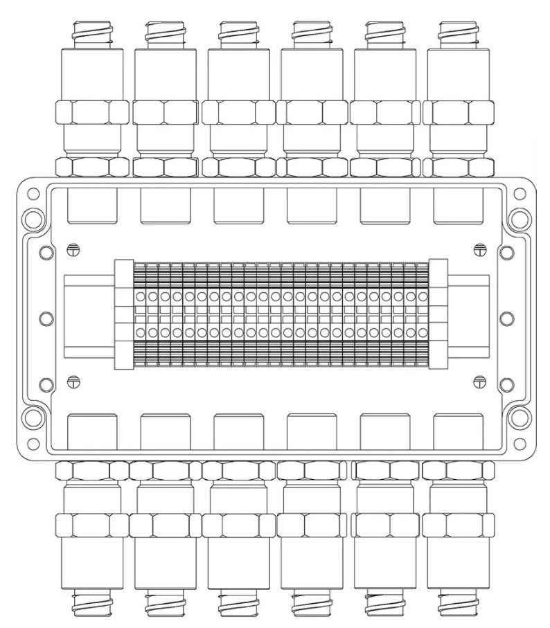 Коробка коммутационная взрывозащищенная 1ExeIIBT5Gb, клеммник 0.5...4 мм.кв. (I=25А) -24 шт, УХЛ1, IP67, t-раб.-60...+85°С, 120х220х91 мм. Корпус из алюминиевого сплава, универсальные кабельные вводы: под кабель 6...12 мм в металлорукаве 15 мм - 12 шт