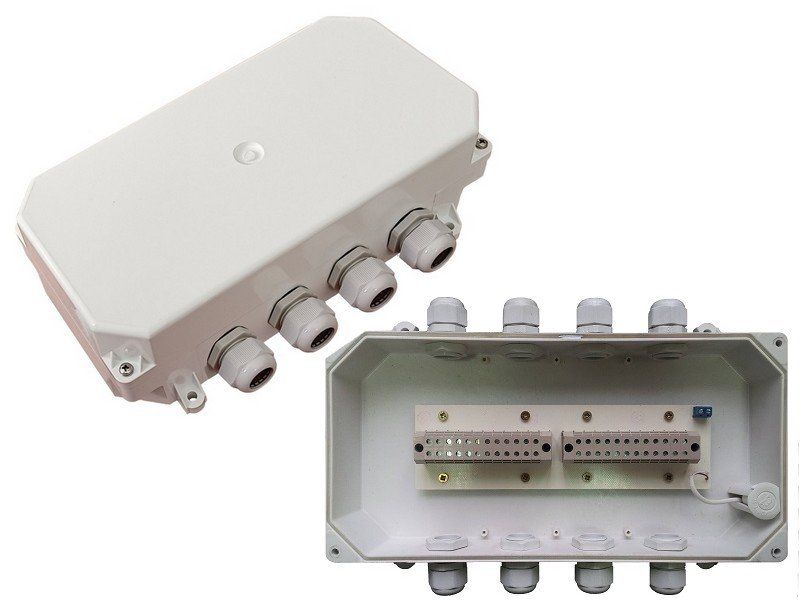Коробка соединительная, корпус из АБС-пластика, 8 пластиковых каб.вводов под кабель Ø 11...17 мм, 24 клеммы, быстрозажимной клеммник WAGO РМ2 (до 4мм.кв.; 300В/30А), тампер (датчик вскрытия); t-раб. -55…+60 °С, IP66/67, габ.размеры без каб.вводов 300х150х95 мм