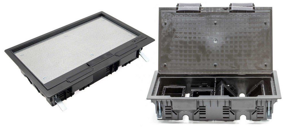 Назначение: организация рабочих мест в помещениях с открытым пространством. Установка производится в плиты фальшпола толщиной от 20 до 45 мм. Отверстие для монтажа 218х335 мм. Глубина монтажа от 73 до 108 мм. Крышка открывается под углом 110˚, "утоплена" ниже уровня пола для монтажа напольного покрытия толщиной до 8 мм. Крышка усилена стальным листом, нагрузка - 450 кг. Ручка с запорным механизмом c двумя положениями: открыто/закрыто. В лючок возможна установка ЭУИ "Viva", "Avanti", "Brava" от ДКС и изделий 45х45. Монтаж в четыре подрозеточных блока на 4 модуля каждый. Комплект поставки: лючок 16 модулей, основание и дно подрозеточного блока 4 модуля – 4 комплекта, винт M4x35 – 4 шт., крепежный элемент 4 шт. – 1 упаковка. Каркасы и рамки для ЭУИ заказываются дополнительно. Цвет - черный.