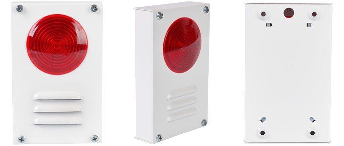 Светозвуковой, красного цвета, раздельное включение; 110 дБ, U-пит.220В, P-потр. 0.76ВАмА(свет) 1.6ВА(звук); IP52, t-раб.-30…+55°C, 125х78х46 мм. Антивандальный металлический корпус