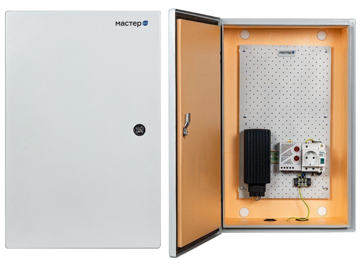 В шкаф установлен гигростат, блок с помощью которого контролируется влажность в шкафу. Его назначение — включение или выключение нагревателя, когда показатели влажности под крышкой шкафа достигают определённой отметки. Благодаря этому относительная влажность удерживается на уровне ниже точки образования росы. В результате при любых колебаниях температуры конденсат не образуется внутри шкафа. Шкаф предназначен для монтажа электрооборудования и может использоваться как внутри помещений, так и снаружи. Универсальность конструктива позволяет размещать оборудование: кроссовое телефонное, активное и пассивное локальных компьютерных сетей, домашних TV-сетей, видеонаблюдения и т п.