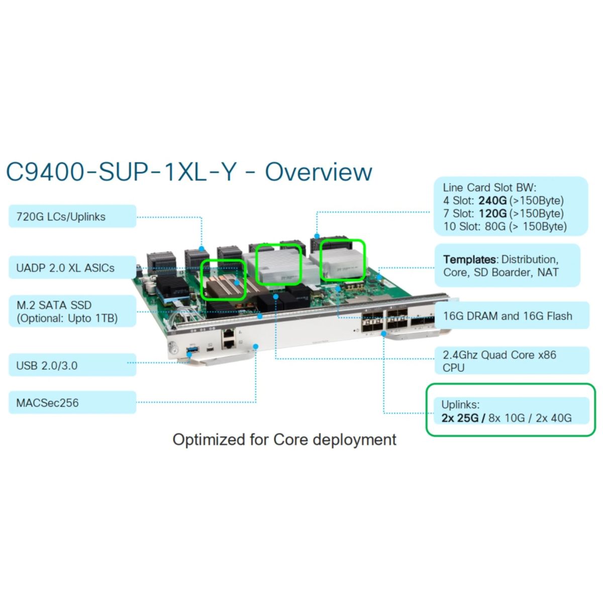 - Модуль построен на базе Cisco Unified Access Data Plane (UADP 2.0) Application-Specific Integrated Circuit (ASIC) для обеспечения максимальной производительности коммутации, маршрутизации трафика, L2 / L3 сервисов, ACL, QoS и др;
