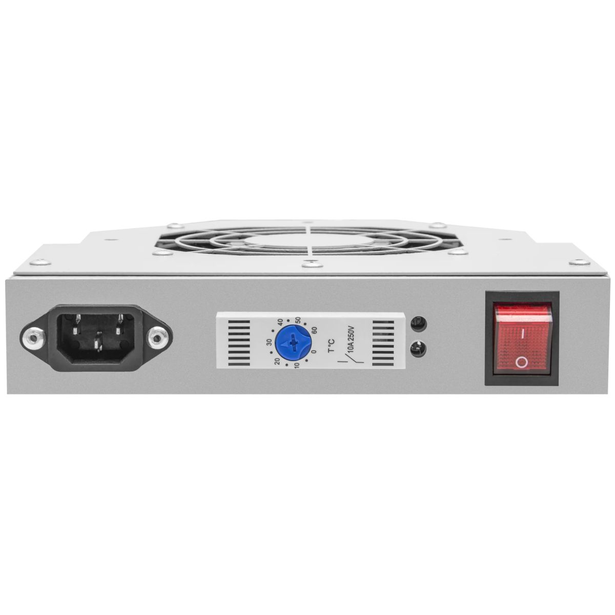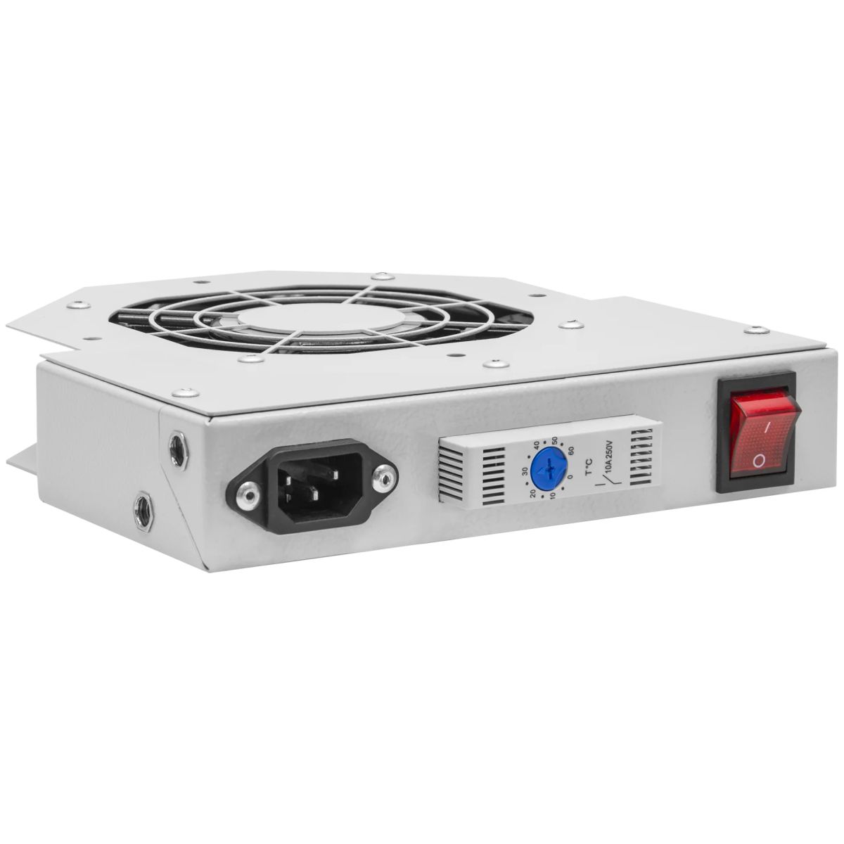 Модуль вентиляторный предназначен для поддержания оптимального температурного режима активного и другого телекоммуникационного оборудования, размещаемого в телекоммуникационных шкафах. Металлический корпус представляет собой несущую конструкцию в которой установлен 1 вентилятор (максимальной производительностью - 165 куб.м. в час), термостат, клавиша вкл/выкл и стандартный штыревой разъем IEC С14.