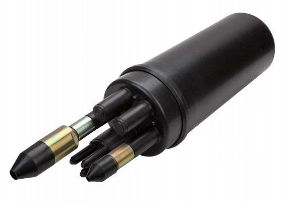 Муфта оптическая, 216 волокон, тупиковая, 4 круглых до 16 мм ввода/вывода, овальный до 10 мм/до 25 мм/транзит 4/2/1, с термо герметизацией корпуса и вводов ТУТ, герметизацией вводов №4 и №5, наружное исполнение, до 6 сплайс кассет (1 в комплекте), -60...+70°C, 523x159 мм.