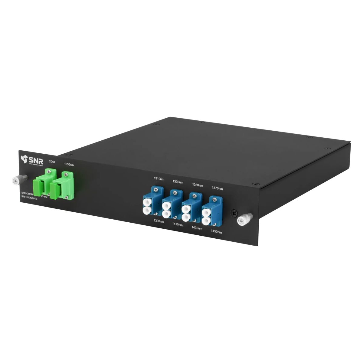Пассивное устройство спектрального мультиплексирования-демультиплексирования для 4-х оптических CWDM каналов + однонаправленного TV канала на несущей 1550нм, работа по одному волокну. Исполнение в виде слотов, устанавливаемых в шасси позволяет более рационально использовать занимаемое пространство.