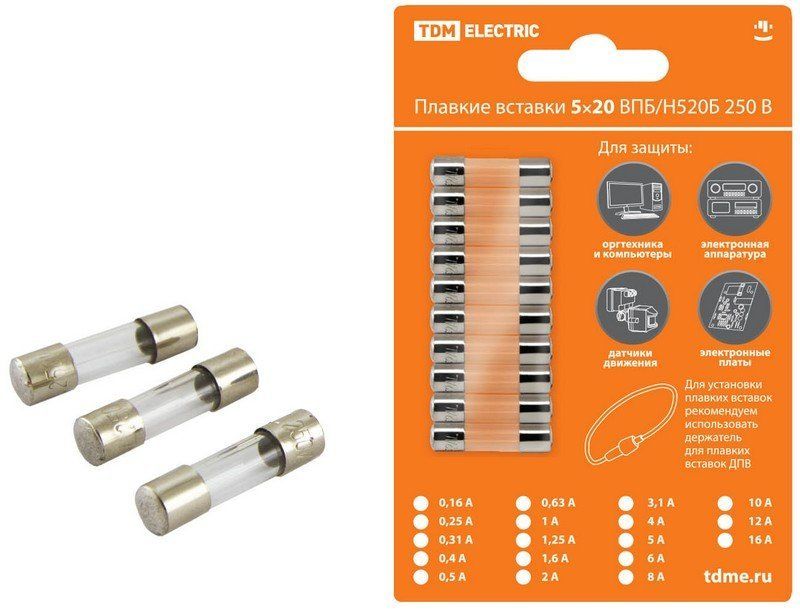 Плавкая вставка (предохранитель); L=20 мм, Ø=5 мм, U-ном. 250 В, I-ном. 8 А, блист.упаковка, 10 шт.