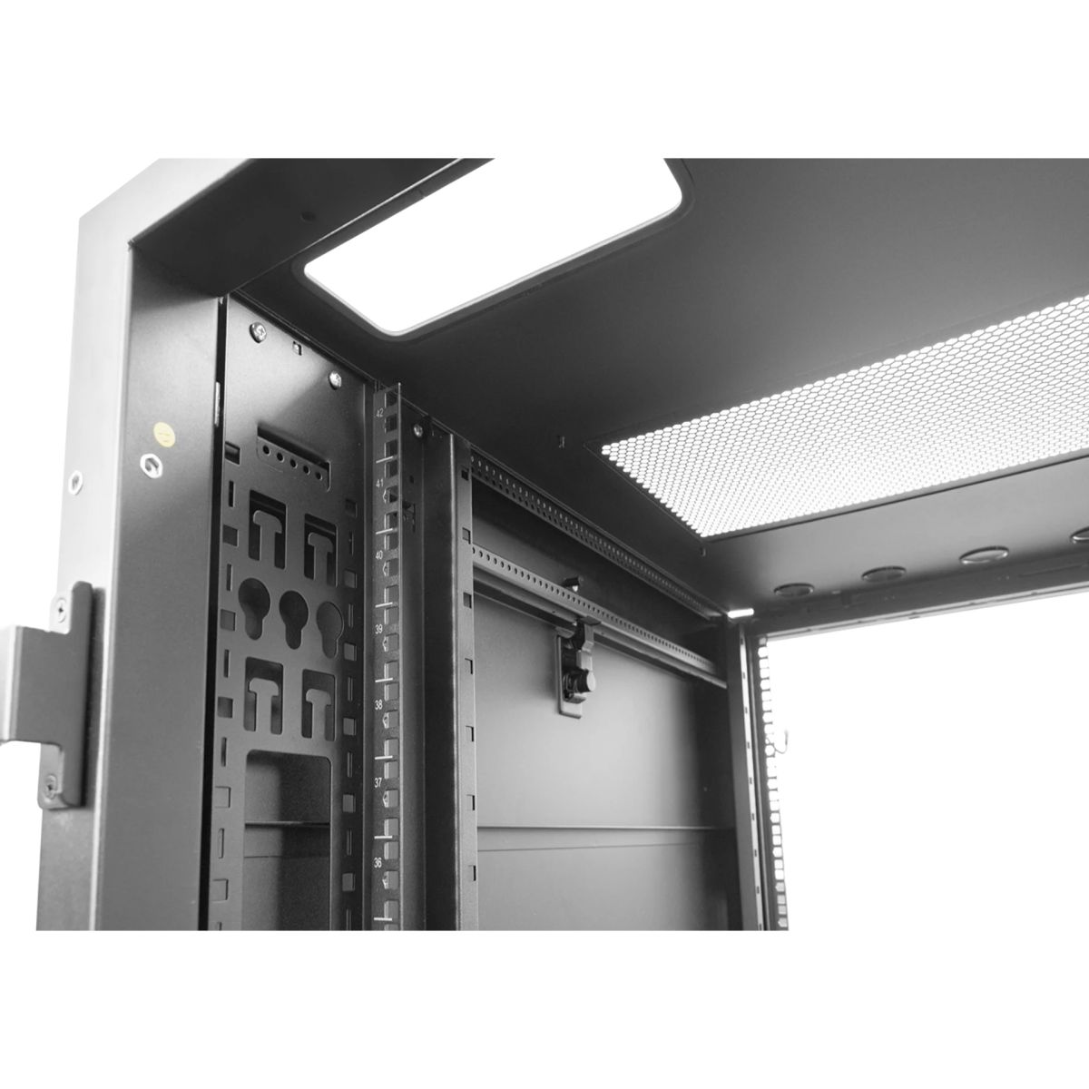 На профилях нанесена маркировка юнитов. Доступ для монтажа, коммутации и обслуживания возможен с четырех сторон, через боковые горизонтальные стенки, переднюю и заднюю двери. Шкаф имеет 4 вертикальные направляющие, с удобной регулировкой по глубине.