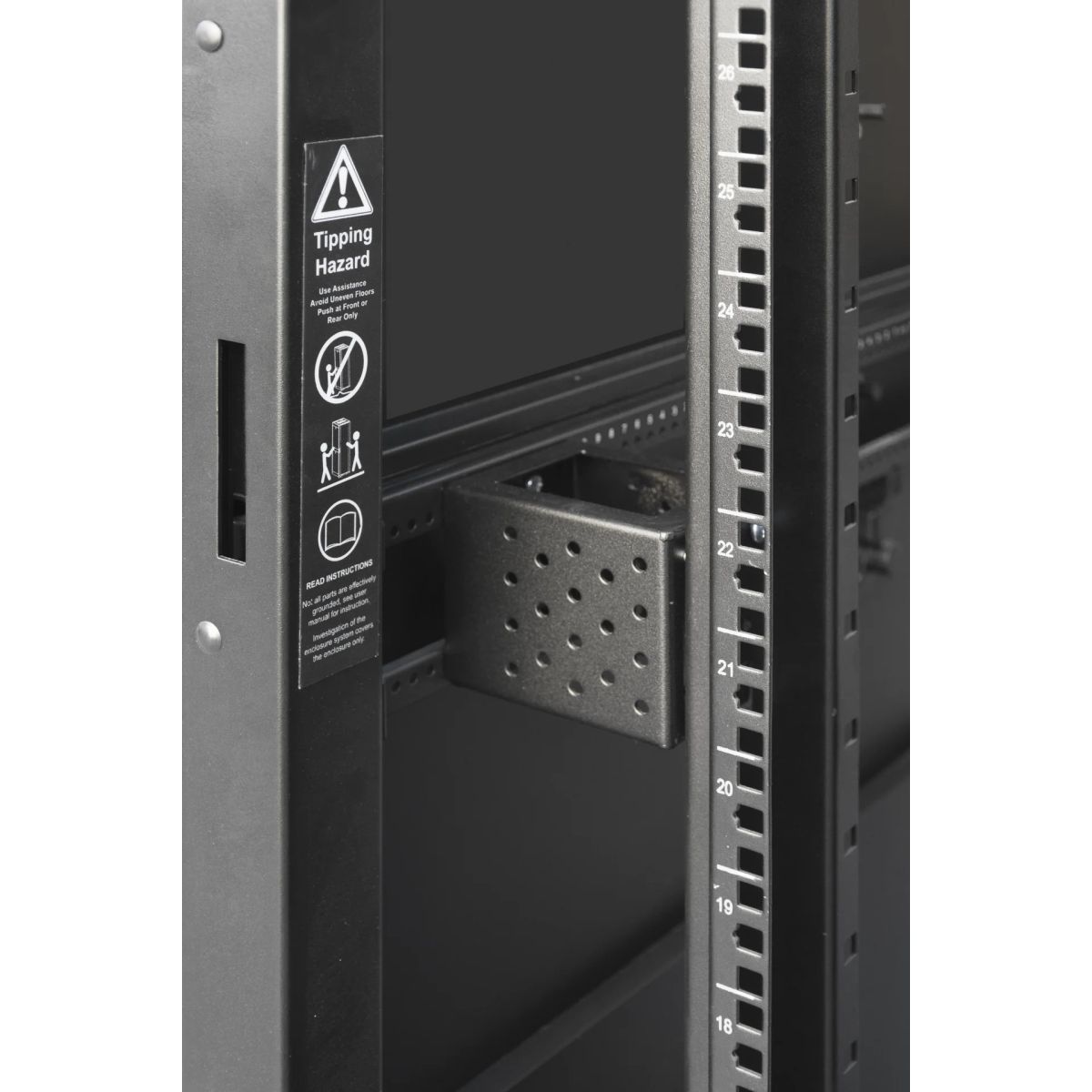 На профилях нанесена маркировка юнитов. Доступ для монтажа, коммутации и обслуживания возможен с четырех сторон, через боковые горизонтальные стенки, переднюю и заднюю двери. Шкаф имеет 4 вертикальные направляющие, с удобной регулировкой по глубине.