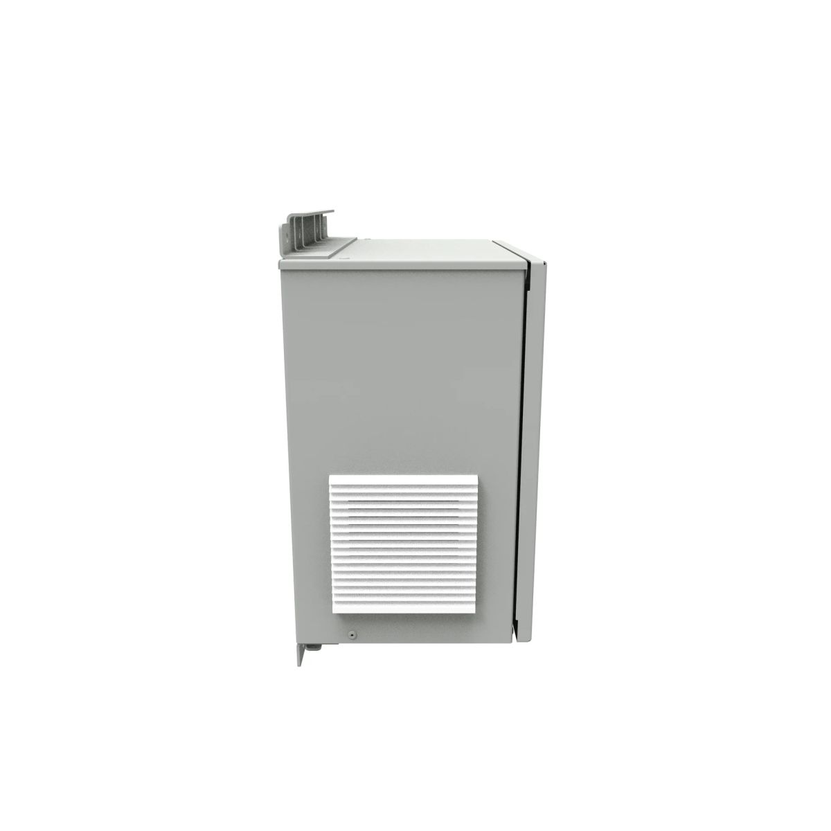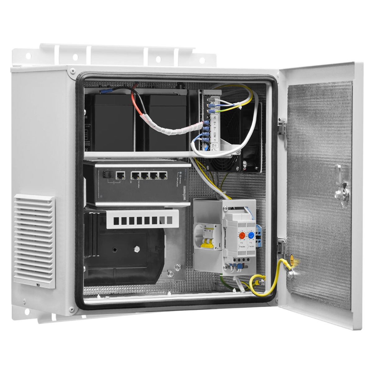 В шкафу предустановлен вентиляторный модуль, с возможностью установки на "вдув" или "выдув". Защитная решетка позволяет предотвратить не только механические воздействия, но и попадание влаги внутрь шкафа. Предустановленные термостаты и нагревательный элемент позволит сохранить температурный режим работы оборудования в зимний период.