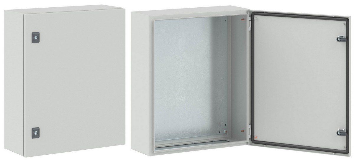 Корпус, монтажная плата, дверь, замок, фланец для ввода кабеля, монтажные аксессуары.