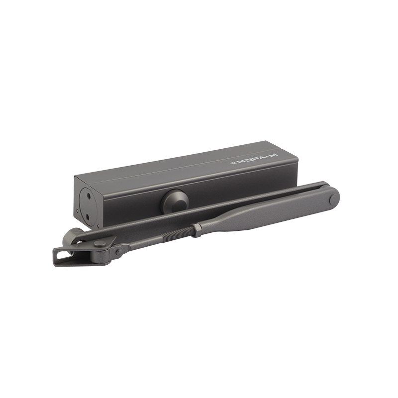 Доводчик в плоском корпусе для дверей весом 40 - 150 кг, двухскоростной, с быстроразъемной рычажной тягой. Класс доводчика EN2-6, установочный размер 100х39 мм, габариты 206х55х40 мм, -45...+60 °С, цвет - графит. Функция ветрового тормоза (Back Check) ограничивает открытие двери при резком ее распахивании, как от интенсивного ветра, так и от резкого открытия. Данная функция позволяет защитить стены и дверную фурнитуру. Морозостойкий доводчик, с ресурсом наработки более 1 млн циклов. Сертифицирован по ГОСТ Р 56177-2014, ГОСТ 538-214. Диапазон рабочей температуры от -45° до +60°С. Класс доводчика по стандарту EN1154 - EN2-6.