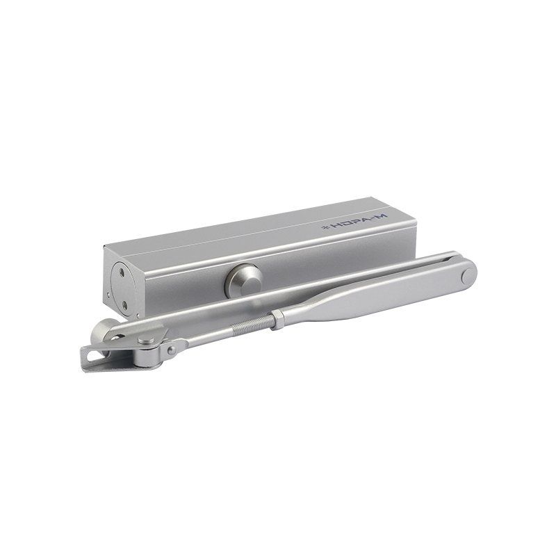 Доводчик в плоском корпусе для дверей весом 40 - 150 кг, двухскоростной, с быстроразъемной рычажной тягой. Класс доводчика EN2-6, установочный размер 100х39 мм, габариты 206х55х40 мм, -45...+60 °С, цвет - серебро. Функция ветрового тормоза (Back Check) ограничивает открытие двери при резком ее распахивании, как от интенсивного ветра, так и от резкого открытия. Данная функция позволяет защитить стены и дверную фурнитуру. Морозостойкий доводчик, с ресурсом наработки более 1 млн циклов. Сертифицирован по ГОСТ Р 56177-2014, ГОСТ 538-214. Диапазон рабочей температуры от -45° до +60°С. Класс доводчика по стандарту EN1154 - EN2-6.