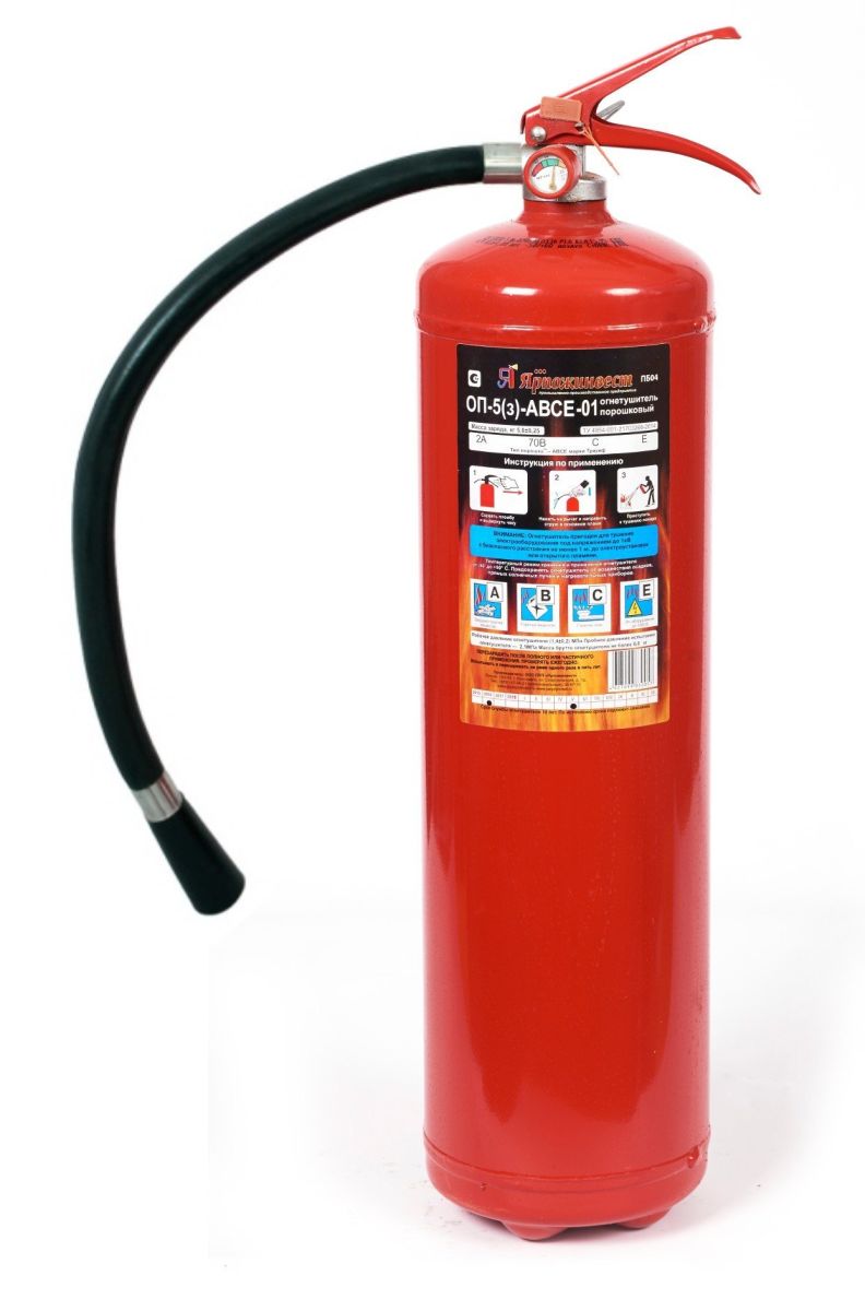 Огнетушители порошковые закачные ОП-5 (з) с массой огнетушащего вещества 5кг предназначены (в зависимости от вида заряженного порошка) для ликвидации пожаров твердых веществ, в основном органического происхождения (класс А); пожаров горючих жидкостей или плавящихся твердых веществ (класс В); пожаров газообразных веществ (класс С), а также пожаров электрооборудования, находящегося под напряжением не более 1000 В (пожар класса Е), при эксплуатации в условиях умеренного климата У, категории 2, тип атмосферы II по ГОСТ 15150.