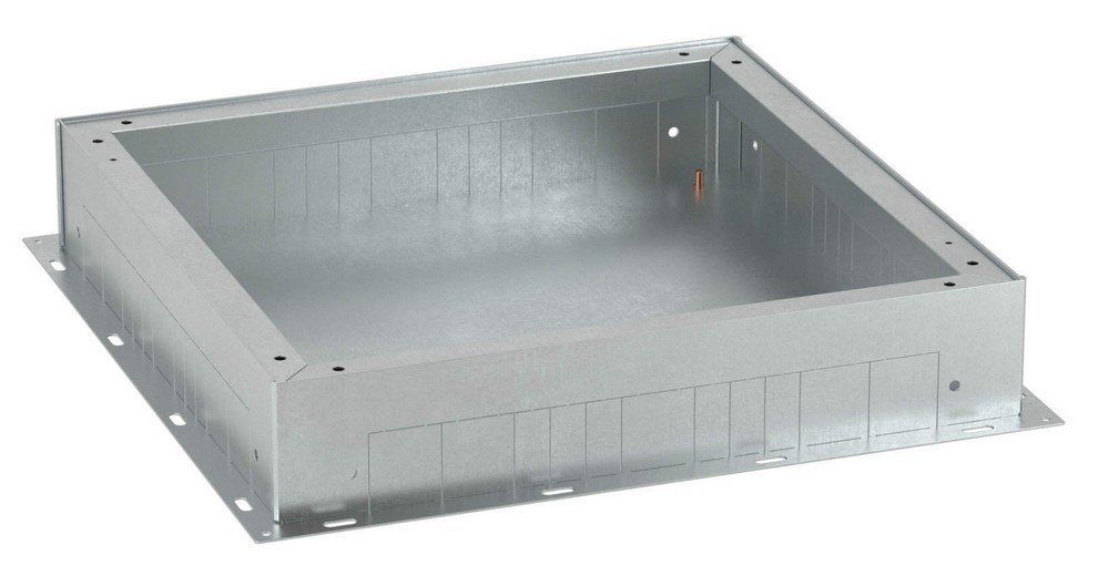 Опалубка для лючков металлическая. Назначение: организация рабочих мест с помощью лючка; организация мест распайки (в качестве распределительной коробки). Характеристики: минимальная высота стяжки 100 мм; высота монтажа регулируется с помощью 4-х специальных винтов, расположенных в углах по периметру опалубки; для монтажа специальный инструмент не требуется; перед установкой крышки, предназначенной для монтажа лючка (код 88212), или сплошной металлической крышки (код 88235), временная крышка (стальная, оцинкованная, идет в комплекте с опалубкой) удаляется сразу после заливки; с 4-х сторон на боковых стенках находится перфорация для ввода стальных (неперфорированных) лотков ДКС с крышками и перегородками серии "S5 Combitech" (типоразмером 50х50, 100х50, 150х50, 200х50, 300х50 или 400х50 мм); с 4-х сторон на боковые стенки можно установить пластины, в каждой из 6-ти отверстий диаметром 50 мм, с кабельными вводами (код 88236); винт заземления расположен внутри опалубки, на дне. Комплект поставки: временная крышка из оцинкованной стали 0,8 мм; металлическая пластина для фиксации кабельных вводов; 6 кабельных вводов диаметром 50 мм для ввода труб в опалубку; метизы.