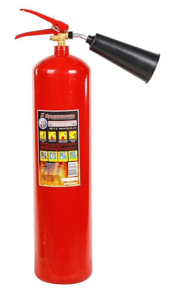 Огнетушитель углекислотный, огнетушащая способность 34В, С, Е; масса огнетушащего вещества 4+0.25 кг, продолжительность подачи ОТВ 8 сек, t-раб.-40…+50°C, габ.размеры D138х725 мм, вес 13.5 кг