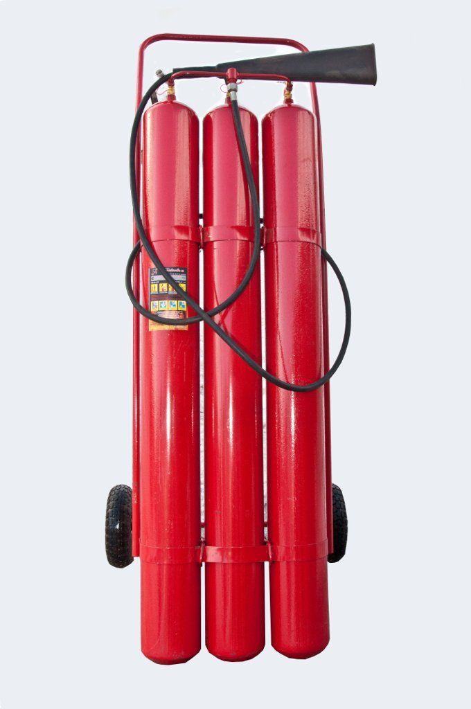 Огнетушитель углекислотный передвижной, вместимость корпуса не менее 3х25.6 л, масса заряда не менее 50 кг, длина струи 4 м, огнетушащая способность 89В, продолжительность подачи не более 210 сек, диапазон рабочих температур -40…+50°С, в комплекте два шланга с раструбом и один смеситель