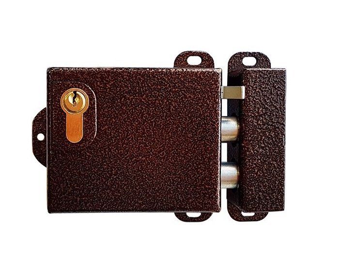 Накладной, универсальный. Снаружи и изнутри открывается ключом. Два засова. Переворот взводного кулачка. Задержка выхода засовов при взводе кулачка. Блокировка от закрывания