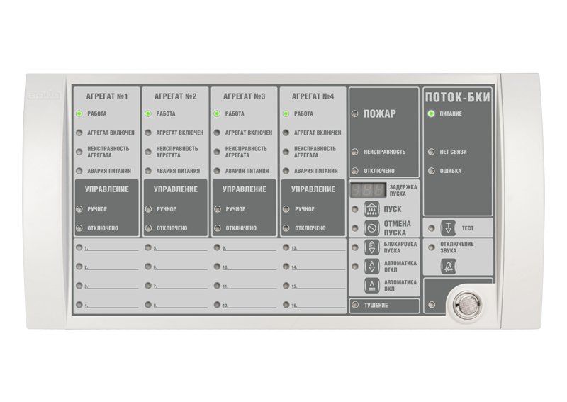 Блок управления и индикации состояния прибора Поток-3Н; 24 индикатора состояния 4 пожарных агрегатов; 14 индикаторов состояния блока «Поток-3Н» и блока «Поток-БКИ»; 1 семисегментный индикатор задержки пуска; 16 индикаторов состояния пожарных и технологических разделов; два интерфейса RS-485; два входа питания, Uпит.10.2...28.4 В, Iпотр.200 мА; IP20, t-раб.-30...+50°С, 340х170х27 мм
