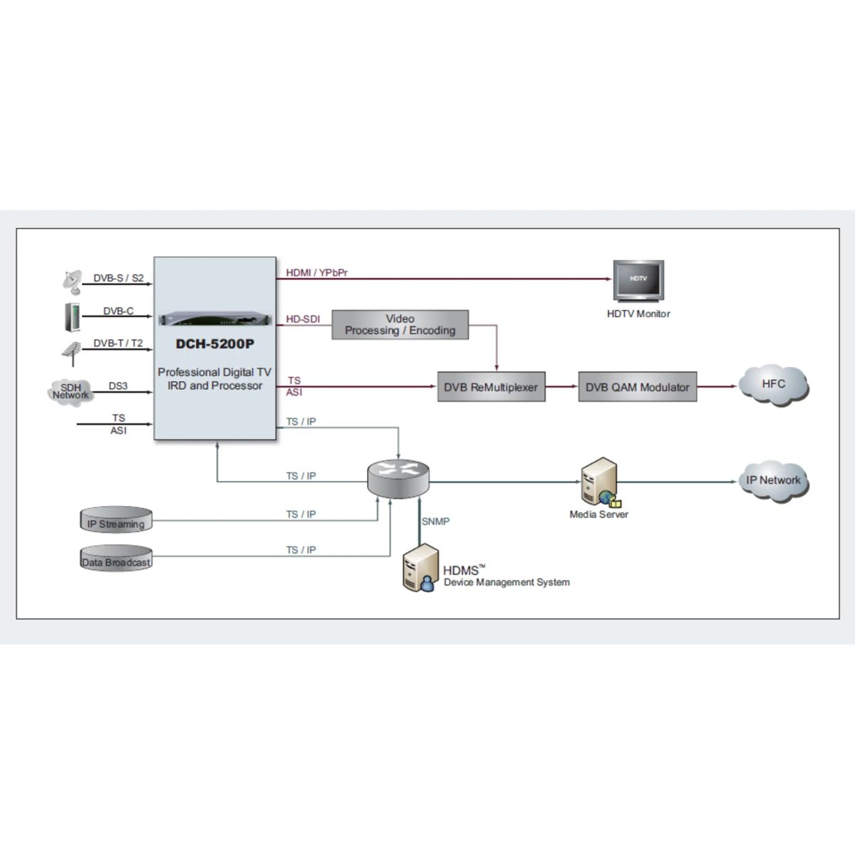 Приёмник DCH-5200P-20S2 производства компании PBI (Китай) - это профессиональный интегрированный приёмник-декодер (IRD), позволяющий принять сигнал одного транспондера DVB-S/S2 и декодировать один из принятых сервисов (каналов) в аналоговый и цифровой форматы. Принятый сигнал можно дескремблировать с помощью CAM-модулей, установленных в два CI слота на передней панели. Декодер может обрабатывать цифровое видео в форматах MPEG-4 AVC / H.264 и MPEG-2 в разрешениях SD и HD. Также данная модель позволяет вывести принятый транспортный поток на выходы ASI.