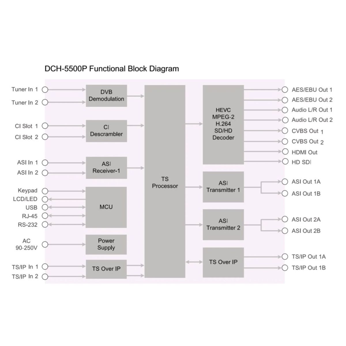 Приёмник DCH-5500P производства компании PBI (Китай) - это профессиональный интегрированный приёмник-декодер (IRD), позволяющий принять сигнал двух транспондеров DVB-S/S2/S2X и декодировать один из принятых сервисов (каналов) в аналоговый и цифровой форматы. Принятый сигнал можно дескремблировать с помощью CAM-модулей, установленных в два CI слота на передней панели. Декодер может обрабатывать цифровое видео в форматах HEVC / H.265, MPEG-4 AVC / H.264 и MPEG-2 в разрешениях SD, HD и UHD. Также данная модель позволяет вывести принятый транспортный поток на выходы ASI или GbE.