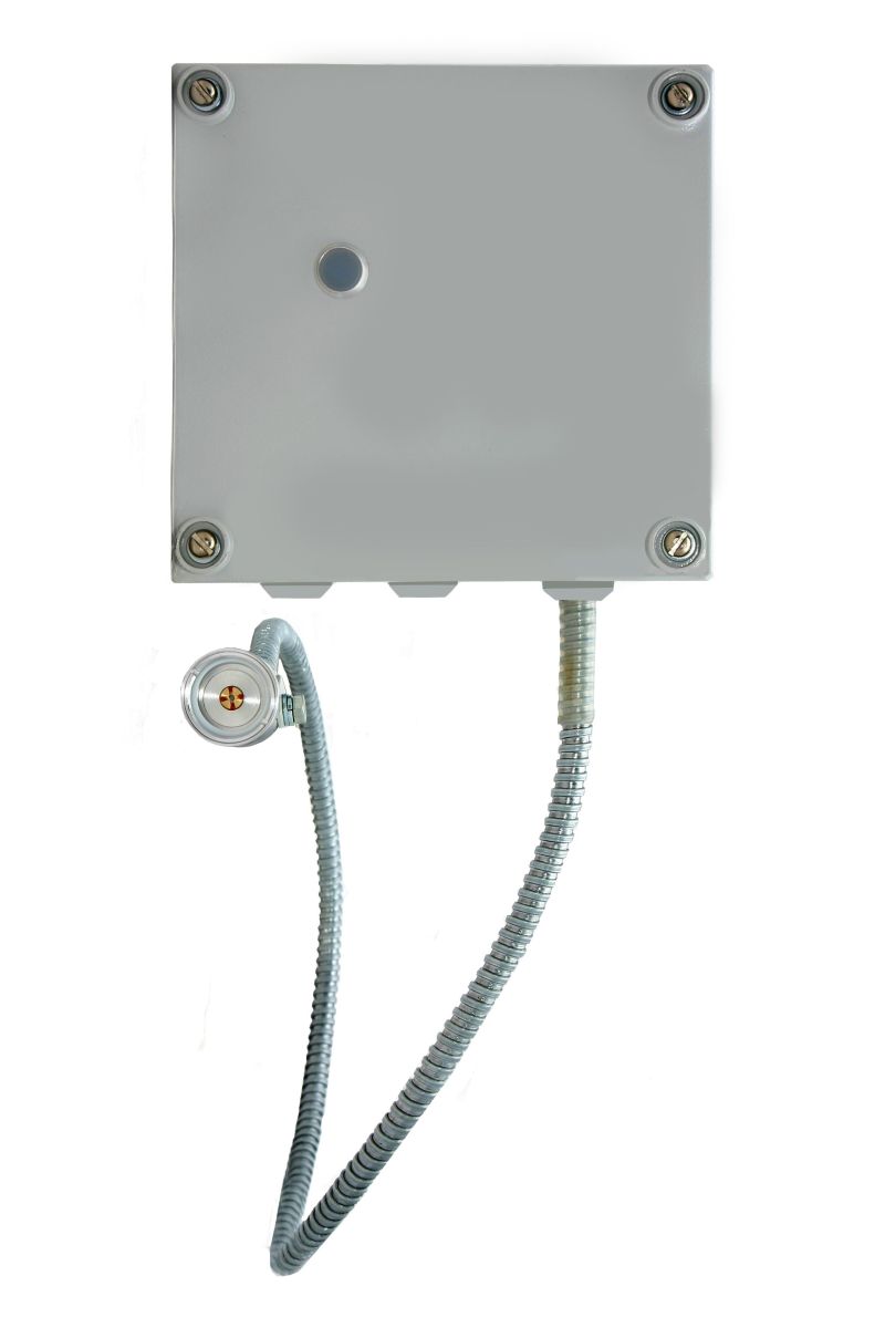 ИК извещатель пламени с ЧЭ на оптическом кабеле в металлорукаве (1...25м), двухпроводный, с фильтрацией периодических помех. Дальность обнаружения до 30м (ТП-5), угол обзора 90°, U-шс.9...28В, I-потр.350мкА, IP55 (66), t-раб.-50...+55°, 200х200х70мм
