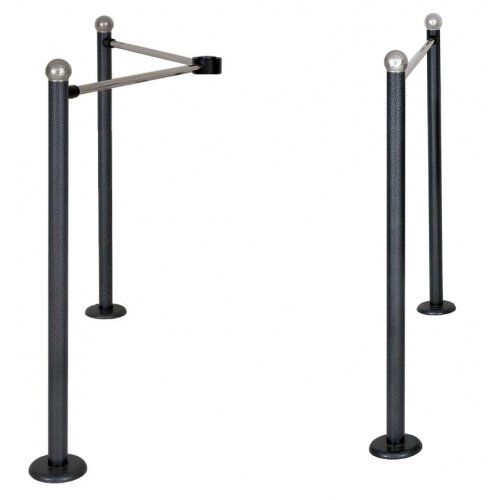 Комплект ограждения для роторного турникета с прямой планкой "Стандарт", состоит из четырех окрашенных стальных стоек с унифицированными крепежными узлами (муфтами) и трех горизонтальных хромированных перемычек диаметром 25мм. Внизу стоек расположены кожухи, под которыми находятся фланцы с тремя отверстиями диаметром 11мм для крепления ограждения к полу.