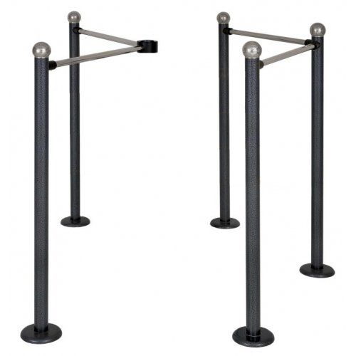 Комплект ограждения для роторного турникета с угловой планкой "Угловое" состоит из пяти окрашенных стальных стоек с унифицированными крепежными узлами (муфтами) и четырех горизонтальных хромированных перемычек диаметром 25мм. Внизу стоек расположены кожухи, под которыми находятся фланцы с тремя отверстиями диаметром 11мм для крепления ограждения к полу.