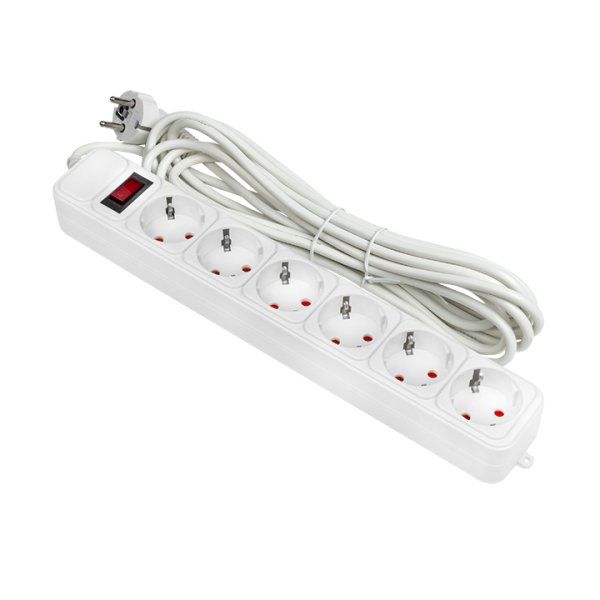 Сетевой фильтр с выключателем со световой индикацией; 6 розеток с заземлением; 3х0.75 мм², 2.2 кВт, 10 А, 5 м. Белого цвета.